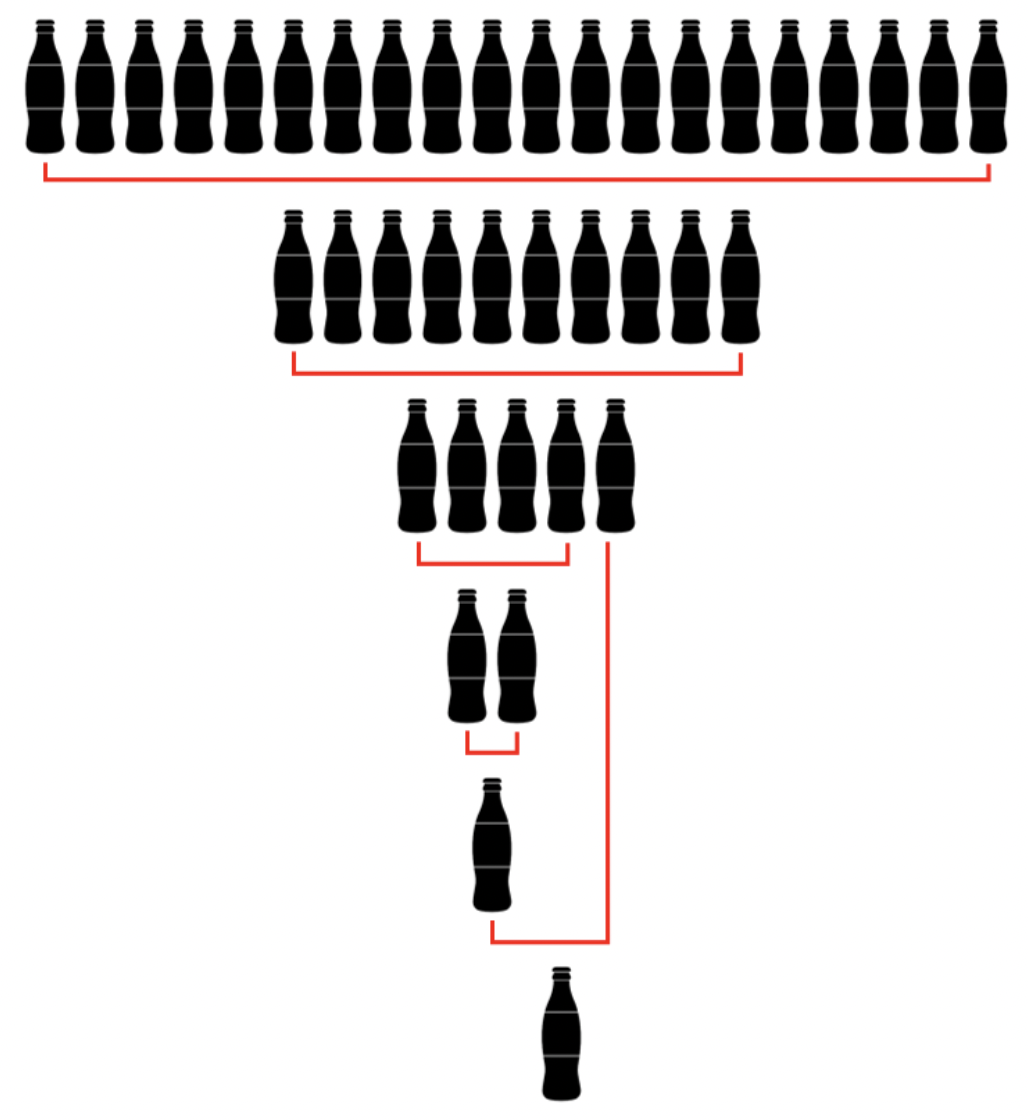 문제를 풀던 상빈이는 콜라 문제의 완벽한 해답을 찾았습니다. 상빈이가 푼 방법은 아래 그림과 같습니다. 우선 콜라 빈 병 20병을 가져가서 10병을 받습니다. 받은 10병을 모두 마신 뒤, 가져가서 5병을 받습니다. 5병 중 4병을 모두 마신 뒤 가져가서 2병을 받고, 또 2병을 모두 마신 뒤 가져가서 1병을 받습니다. 받은 1병과 5병을 받았을 때 남은 1병을 모두 마신 뒤 가져가면 1병을 또 받을 수 있습니다. 이 경우 상빈이는 총 10 + 5 + 2 + 1 + 1 = 19병의 콜라를 받을 수 있습니다.
