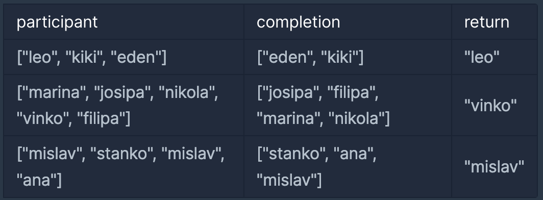 "mislav"는 참여자 명단에는 두 명이 있지만, 완주자 명단에는 한 명밖에 없기 때문에 한명은 완주하지 못했습니다.