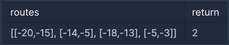 - routes에는 차량의 이동 경로가 포함되어 있으며 routes[i][0]에는 i번째 차량이 고속도로에 진입한 지점, routes[i][1]에는 i번째 차량이 고속도로에서 나간 지점이 적혀 있습니다.