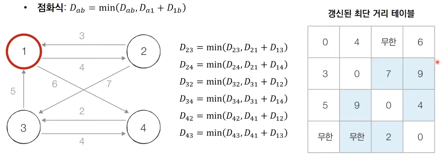 - [Step1] 1번 노드를 거쳐가는 경우를 고려하여 테이블을 갱신