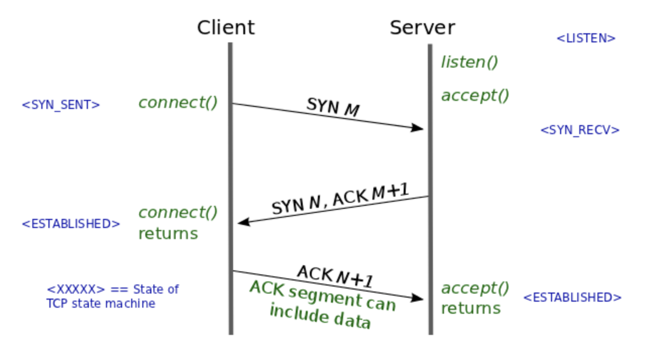 일단 클라이언트가 자신의 목소리가 들리는지 물어본다.(SYN) 서버는 클라이언트의 목소리가 들린다고 말한다. (SYN +1) 그리고 자신의 목소리가 들리는지 물어본다. (ACK) 클라이언트는 서버의 목소리가 들린다고 말한다. (ACK + 1)이런 과정인 셈이다.