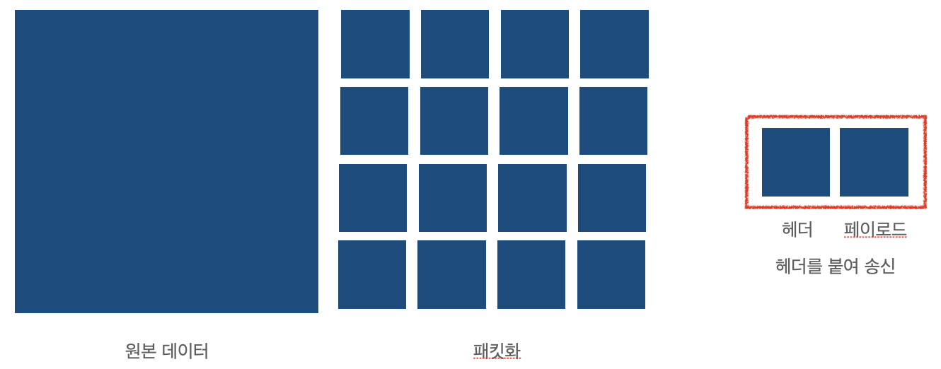 ๊ทธ๋์ ์๊ฒจ๋ ๋ฐฉ์์ด ํจํท ๊ตํ ์ด๋ค. ํจํท ๊ตํ์ ์ฃผ๊ณ ๋ฐ๋ ๋ฐ์ดํฐ๋ฅผ 'ํจํท'์ด๋ผ๊ณ ํ๋ ์์ ๋ฉ์ด๋ฆฌ๋ก ๋๋๊ณ , ํ์ ์ ๊ณต์ฉํด์ ๋ณต์์ ํต์ ์ ๋ด๋ณด๋ด๋ ๋ฐฉ์์ด๋ค. ํจํท์๋ ์ค์ ๋ก ์ํฌ์ ์ด์ก์ฅํผ๋ผ ํ๋ฌผ ์ด์ธ์๋ ๋ฐ๋ ๊ณณ์ด๋ ๋ณด๋ธ ๊ณณ ๋ฑ์ ์ ๋ณด๊ฐ ๋ถ๊ฐ๋๋ค. ์ด์ก์ฅ์ ํด๋นํ๋ ๊ฒ์ ํค๋, ํ๋ฌผ์ ํด๋นํ๋ ๊ฒ(์๊ฒ ๋๋ ๋ฐ์ดํฐ)์ ํ์ด๋ก๋๋ผ๊ณ ํ๋ค. ํค๋์๋ ๋ฐ๋ ๊ณณ์ด๋ ๋ณด๋ด๋ ๊ณณ ์ด์ธ์ ์๋ถํ ๋ฐ์ดํฐ ์์ ๋ฑ๋ ๊ธฐ๋ก๋๋ค. ์ด๋ ๊ฒ ํจ์ผ๋ก์จ ๋ฐ์ดํฐ๋ฅผ ์๊ฒ ๋ถํ ํ์ฌ ์ ์กํ๋๋ผ๋ ๋์ฐฉํ ๊ณณ์์ ์๋๋๋ก ๋ณต์ํ ์ ์๋ค.