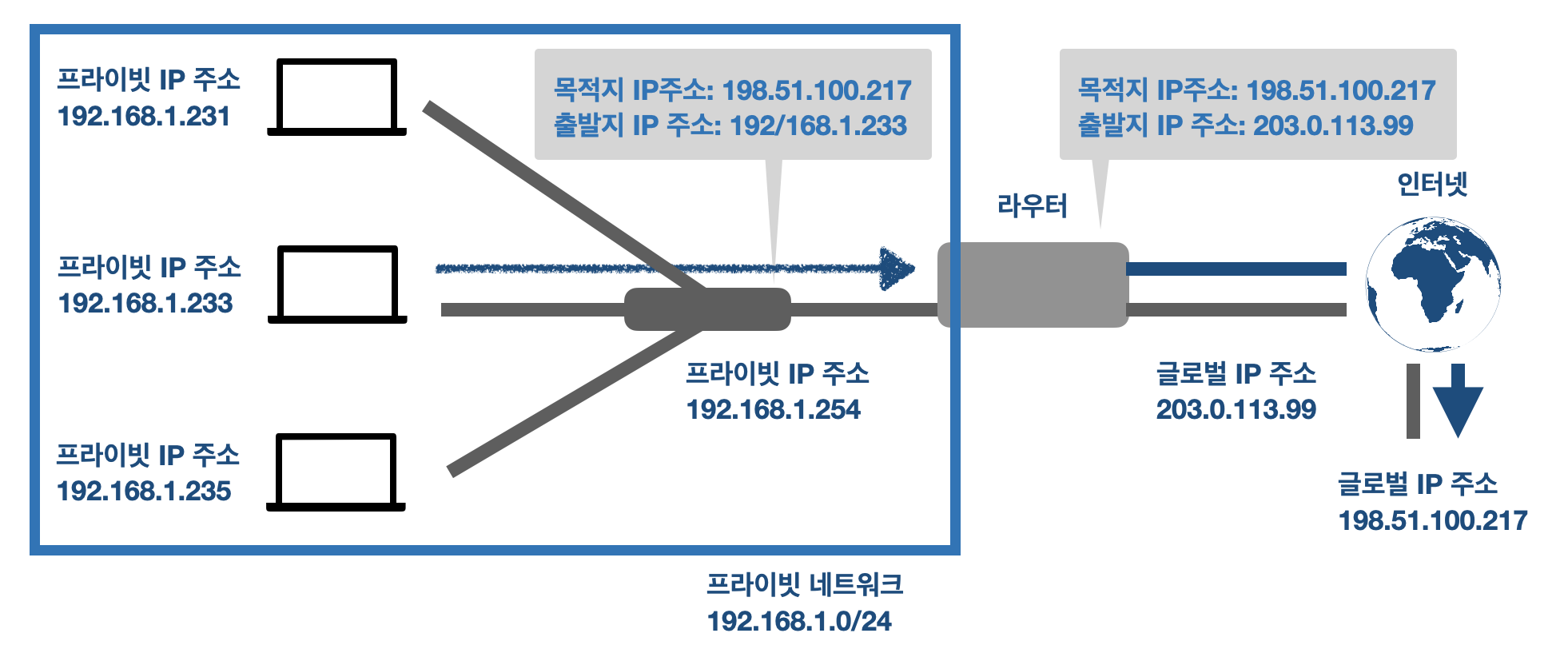 ์ฌ๊ธฐ์์ ํ๋ผ์ด๋น IP ์ฃผ์๋ฅผ ๊ฐ์ง ์ปดํจํฐ๋ก ์ธํฐ๋ท์์ ๊ธ๋ก๋ฒ IP ์ฃผ์๋ฅผ ๊ฐ์ง ์๋ฒ์ ์ ์ํ๋ค๊ณ ๊ฐ์ ํ๋ค. ์ด๋ ํ๋ผ์ด๋น IP ์ฃผ์์ธ ์ฑ๋ก๋ ์ธํฐ๋ท์์์ ๋ผ์ฐํ ํ ์ ์๋ค. ๋ผ์ฐํฐ๊ฐ ํ๋ผ์ด๋น IP ์ฃผ์๋ฅผ ๊ธ๋ก๋ฒ IP ์ฃผ์๋ก ๋ณํํด์ฃผ์ด์ผ๋ง ๋ฐ์ดํฐ๋ฅผ ์ ์กํ ์ ์๋ค. ์ด ๊ธฐ์ ์ด NAT์ด๋ค.