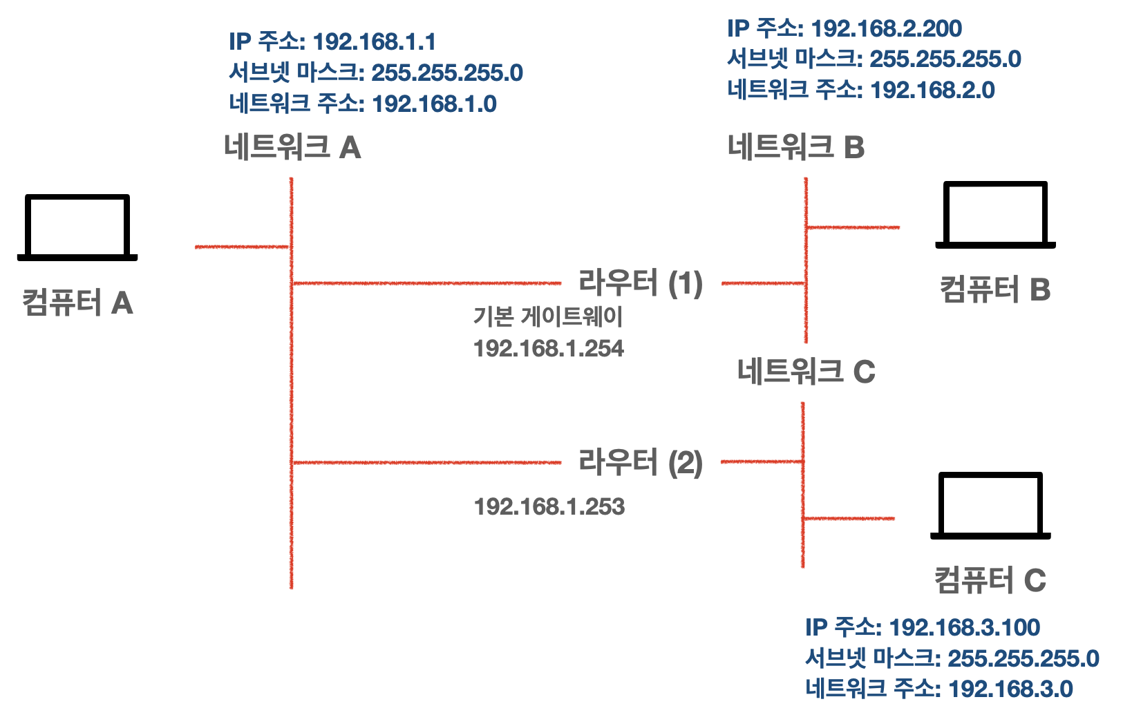 ์ปดํจํฐ A๋ ์ปดํจํฐ B์ ๋ฐ์ดํฐ๋ฅผ ๋ณด๋ด๊ณ ์ถ์ง๋ง, ์๋ก ๋ค๋ฅธ ๋คํธ์ํฌ์ ์ํด ์๊ธฐ ๋๋ฌธ์ ์ง์ ์ ์ผ๋ก ๋ฐ์ดํฐ๋ฅผ ๋ณด๋ผ ์ ์๋ค. ๊ทธ๋์ ๋ผ์ฐํฐ๋ผ๋ ๋คํธ์ํฌ ๊ธฐ๊ธฐ๊ฐ ๊ฐ์ ํ๊ฒ ๋๋ค.