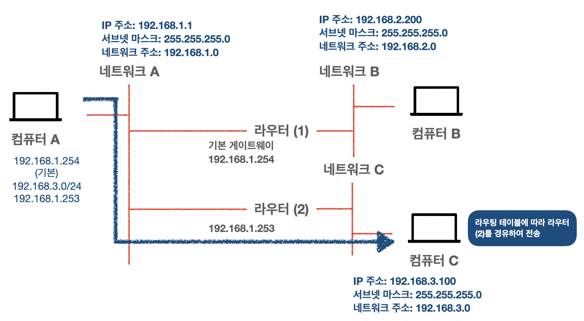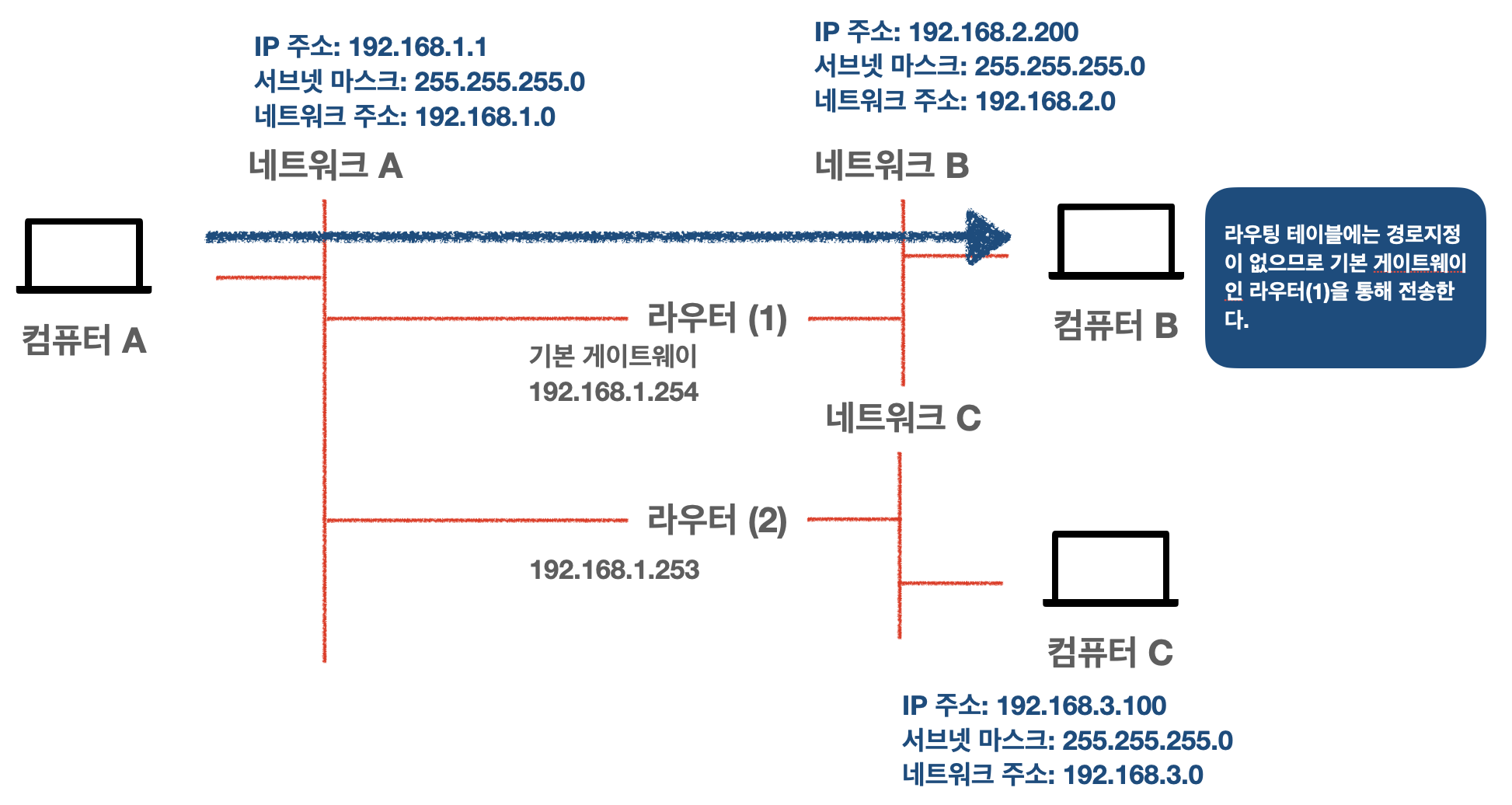 ์ปดํจํฐ A๊ฐ ์ปดํจํฐ B์ ๋ฐ์ดํฐ๋ฅผ ๋ณด๋ผ ๋ ์ด๋ค ๋ผ์ฐํฐ๋ก ๋ณด๋ด์ผ ํ ์ง ๋ชจ๋ฅด๋ ๊ฒฝ์ฐ, ์ปดํจํฐ A๋ ๊ธฐ๋ณธ๊ฒ์ดํธ์จ์ด๋ผ๊ณ ํ๋ ๋ผ์ฐํฐ๋ก ๋ฐ์ดํฐ๋ฅผ ์ก์ ํ๋ค. ๊ธฐ๋ณธ ๊ฒ์ดํธ์จ์ด๋ '๊ท์ ์์ ์ฒ'๋ฅผ ์๋ฏธํ๋ฉฐ, ์ ์กํ ๋ผ์ฐํฐ๊ฐ ์ ํด์ ธ ์์ง ์์ ๊ฒฝ์ฐ์๋ ๋ฐ๋์ ์ด๊ณณ์ผ๋ก ๋ณด๋ธ๋ค๊ณ ๊ท์น์ผ๋ก ์ ํด ๋์๋ค.