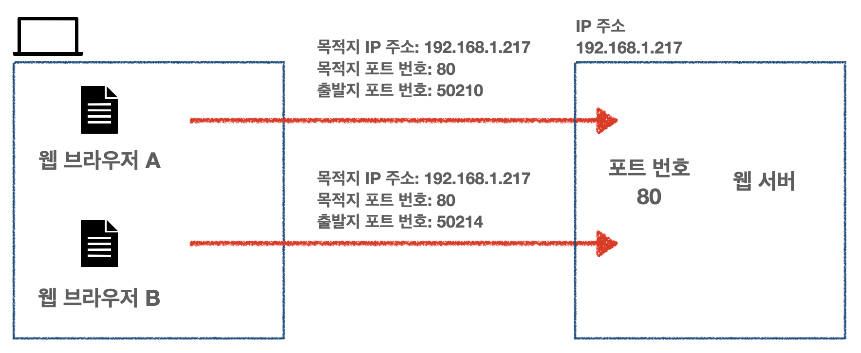 ๋์ ํฌํธ ๋ฒํธ๋ ์ถ๋ฐ์ง ์ ์ ํฌํธ ๋ฒํธ๋ก ์ด์ฉ๋๋ค. ์๋ฅผ ๋ค์ด ์ปดํจํฐ์์ ์น ๋ธ๋ผ์ฐ์ ๋ฅผ 2๊ฐ ์คํํ์ฌ ๊ฐ์ ์น ์ฌ์ดํธ๋ฅผ ์ด ๋, ์ถ๋ฐ์ง ํฌํธ ์๋ณ ๊ธฐ๋ฅ์ด ์์ผ๋ฉด ์ฌ๋ฐ๋ฅด๊ฒ ํต์ ํ ์ ์๋ค. ์ด ๊ฒฝ์ฐ ์น ๋ธ๋ผ์ฐ์ A์ HTTP ์ ์๊ณผ ์น ๋ธ๋ผ์ฐ์ B์ HTTP ์ ์์ ๊ฐ๊ฐ ๋ค๋ฅธ ์ถ๋ฐใ ํฌํธ ๋ฒํธ๋ฅผ ํ ๋นํ์ฌ ๊ตฌ๋ณํ ์ ์๋ค.