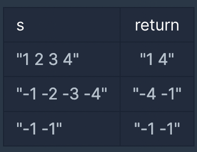 예를들어 s가 "1 2 3 4"라면 "1 4"를 리턴하고, "-1 -2 -3 -4"라면 "-4 -1"을 리턴하면 됩니다.