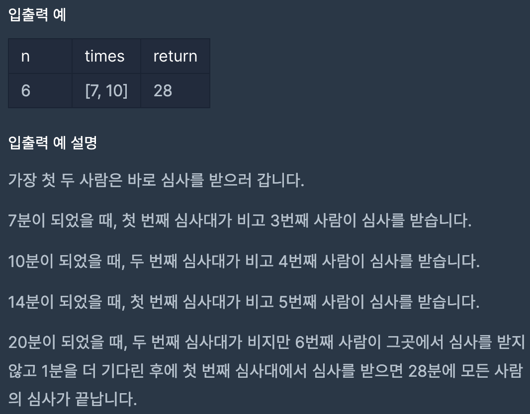 입국심사를 기다리는 사람 수 n, 각 심사관이 한 명을 심사하는데 걸리는 시간이 담긴 배열 times가 매개변수로 주어질 때, 모든 사람이 심사를 받는데 걸리는 시간의 최솟값을 return 하도록 solution 함수를 작성해주세요.