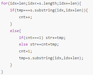 만약 tmp값과 같지 않으면서 cnt값이 1이 아닌 경우는 앞에서 tmp와 값이 같았던 적이 있음으로 cnt+tmp값을 str에 넣어주고 tmp값을 현재의 값으로 update해준다.