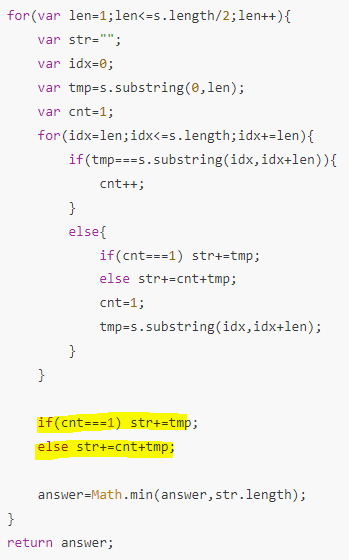 그 다음 줄의 answer.Math.min(answer, str.length); => Math의 내장함수인 min()을 이용하여 answer와 str의 길이 중 더 짧은 값을 answer에 저장해준다. answer의 초깃값은 처음 들어온 string.length로 하나도 조각 나지 않는 경우도 있을 경우를 위해 string.length로 초기화를 시켜준 것이다. answer값을 for문을 돌 때마다 update되며 마지막에는 가장 작은 값으로 update되게 된다.