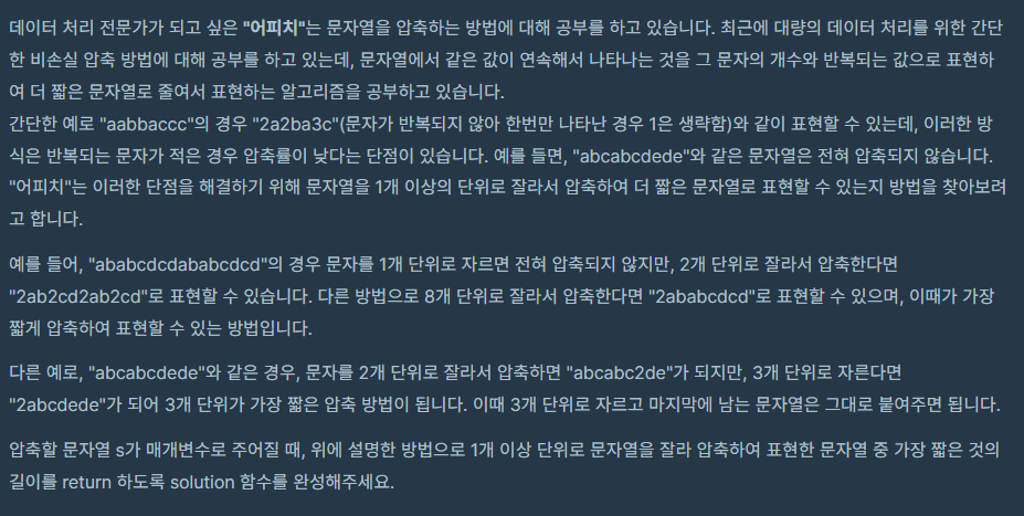 데이터 처리 전문가가 되고 싶은 "어피치"는 문자열을 압축하는 방법에 대해 공부를 하고 있습니다. 최근에 대량의 데이터 처리를 위한 간단한 비손실 압축 방법에 대해 공부를 하고 있는데, 문