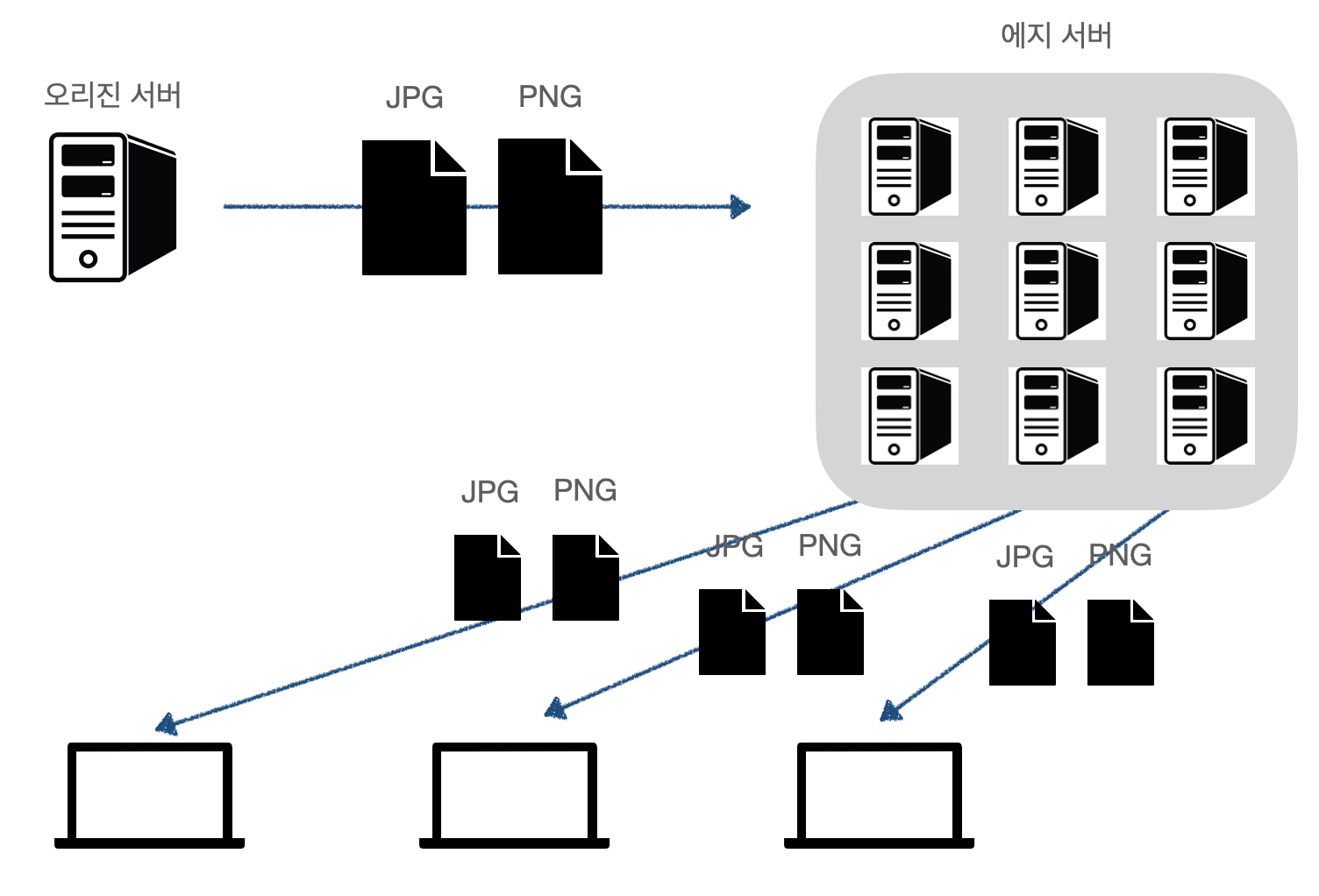 배포처에 가까운 네트워크(커스터머 에지)에 콘텐츠를 배포하는 서버(에지 서버)를 배치해서 구성한다. 에지 서버는 원본 데이터를 가진 서버(오리진 서버)의 데이터 사본을 캐시로 가지고 있다가, 오리진 서버를 대신해서 클라이언트 요청에 응답한다.