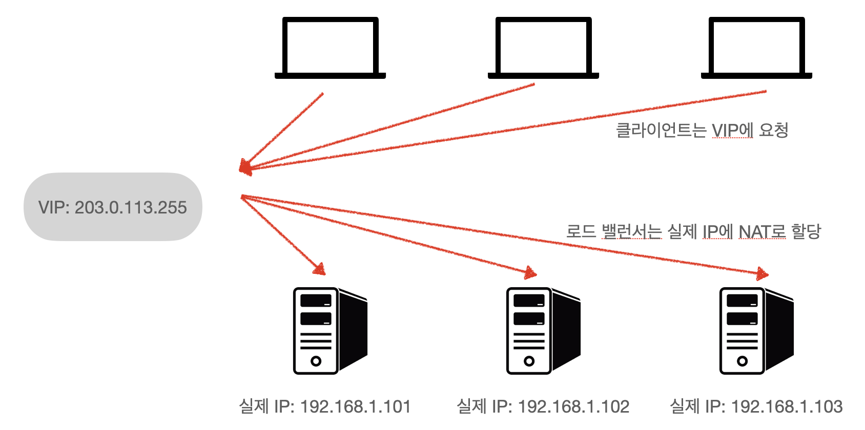 NAT형이란 VIP라는 가상 IP 주소에 대한 요청을 실제 서버 여러 대에 할당하는 방식이다.