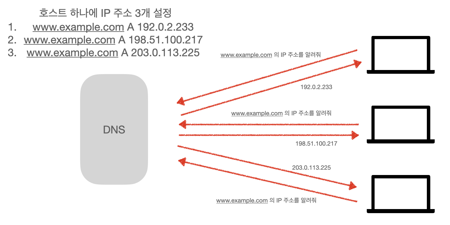 DNS 라운드 로빈은 DNS 시스템을 사용해서 요청을 서버 여러 개로 분산하는 방식이. 한 호스트 이름에 IP주소를 여러 개 설정함으로써 요청받은 DNS 서버는 차례대로 IP주소를 반환한다.