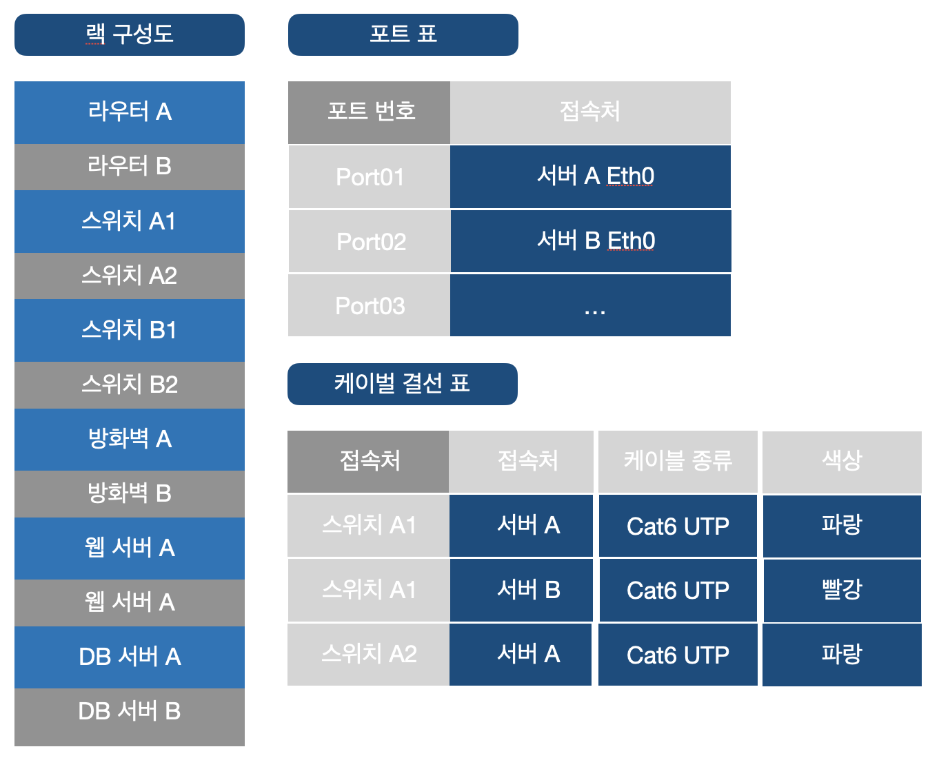 네트워크 구성도에는 물리 설계도와 논리 설계도가 있다. 물리 설계도에는 네트워크 기기가 포트별로 어디로 접속하는지와 기록한 포트 표나 랙의 어느 위치에 어떤 기기를 넣을지 기록한 랙 구성도, 케이블을 연결할 곳, 종류, 색 등 정보를 정리한 케이블 결선 표 등이 있다.