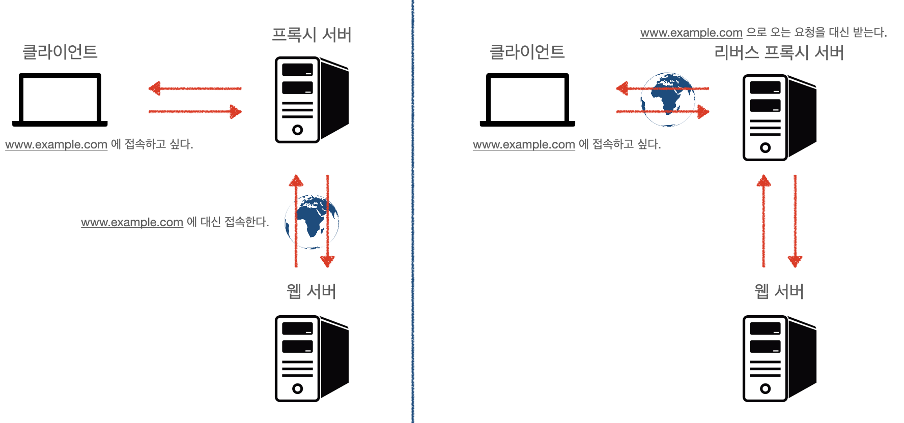 프록시란 대리나 대행이라는 뜻으로, 프록시 서버는 클라이언트 쪽에 설치되어 클라이언트가 웹 서버에 액세스하는 것을 중계하는 역할을 한다. 즉 웹서버에 액세스 하는 것을 대행한다.