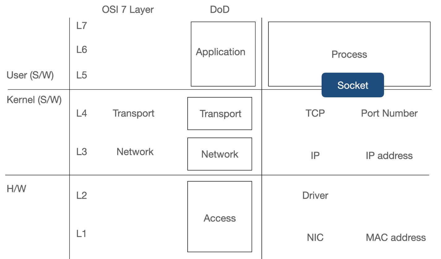 - 각 Process는 Network에 접속하려고 하면 Socket이 열리게 된다. Socket은 TCP 추상화한 인터페이스 정보를 포함하기 때문에 Port번호를 갖게 되는데, 이 Port번호는 각 Process마다 서로 중복되지 않게 할당되게 된다.