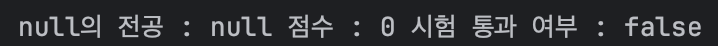 System.out.println(name + "의 전공 : " + major + " 점수 : " + score + " 시험 통과 여부 : " + isPassed);